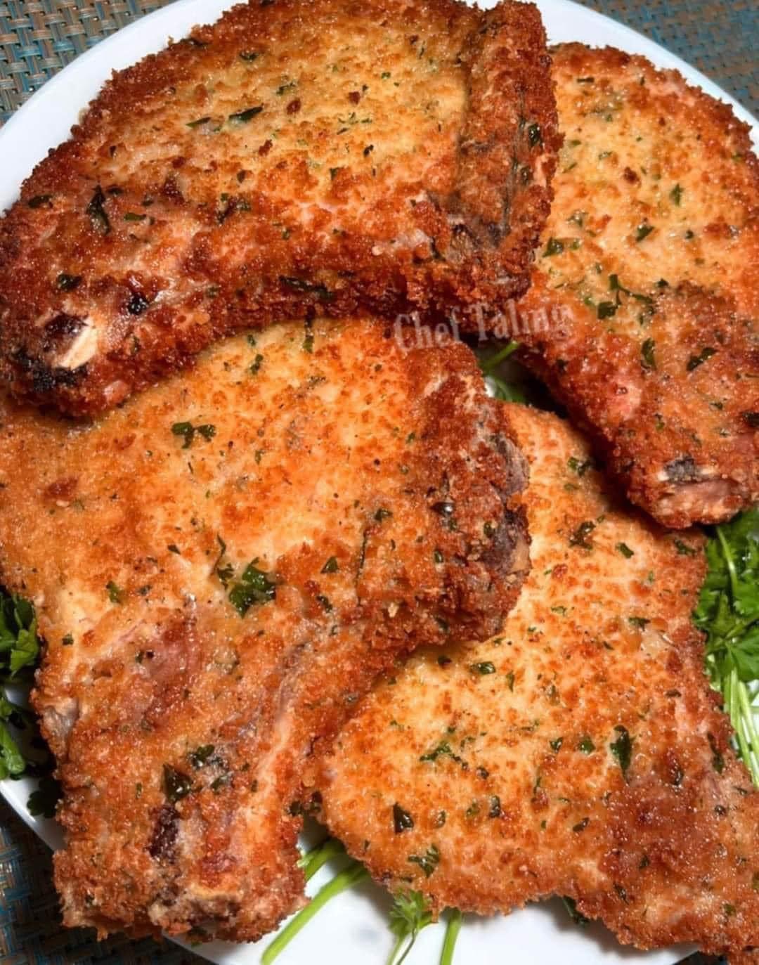 Janet’s Parmesan baked pork chops are easy to make and a great weeknight dinner option. They’re tender, juicy, and full of flavor. The flavors of garlic and Parmesan cheese pop in the savory breading.