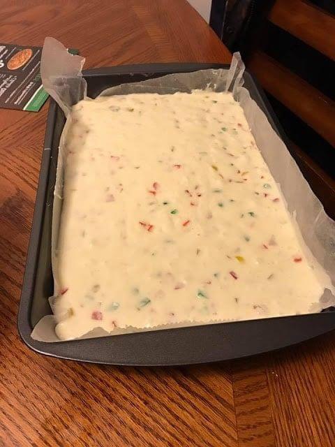 - Layer a baking dish with parchment paper, be sure there is enough paper hanging over the sides