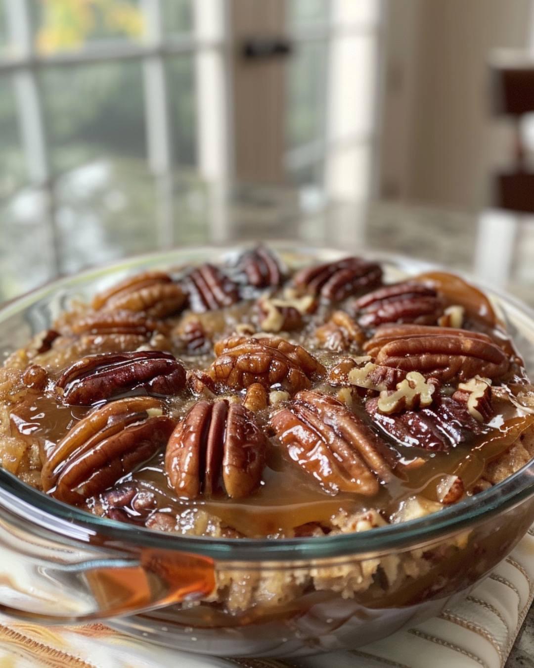 Carefully pour the liquid over the entire cobbler mixture, without stirring. The liquid will create a rich, gooey pecan pie layer as it bakes.