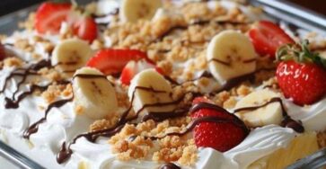 This Banana Split Cake is a no bake dessert with a graham cracker crust, followed by layers of sweetened cream cheese, sliced bananas, crushed pineapple, whipped cream, and delicious maraschino …
