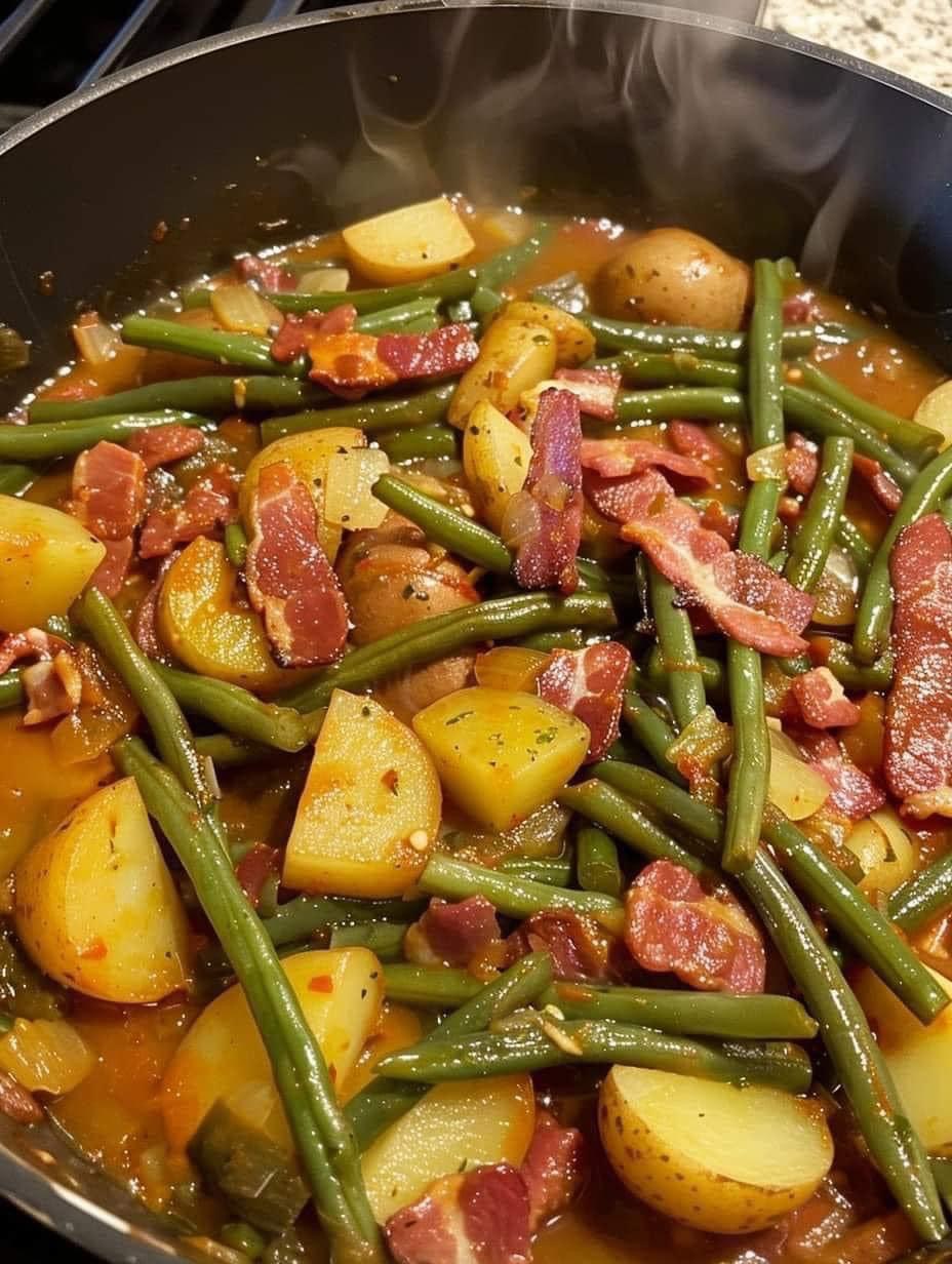Smothered Green Beans with Potatoes is almost done! One of my favorite wallet friendly meals! Ingredients 4 slices thick-cut hickory-smoked bacon, chopped (I used smoked sausage) ½ cup sliced yellow …